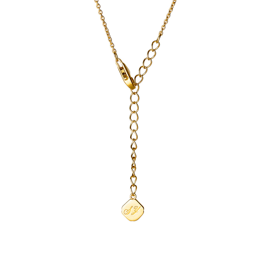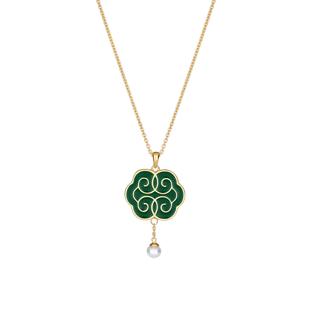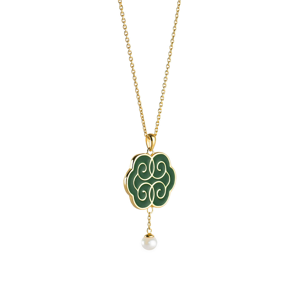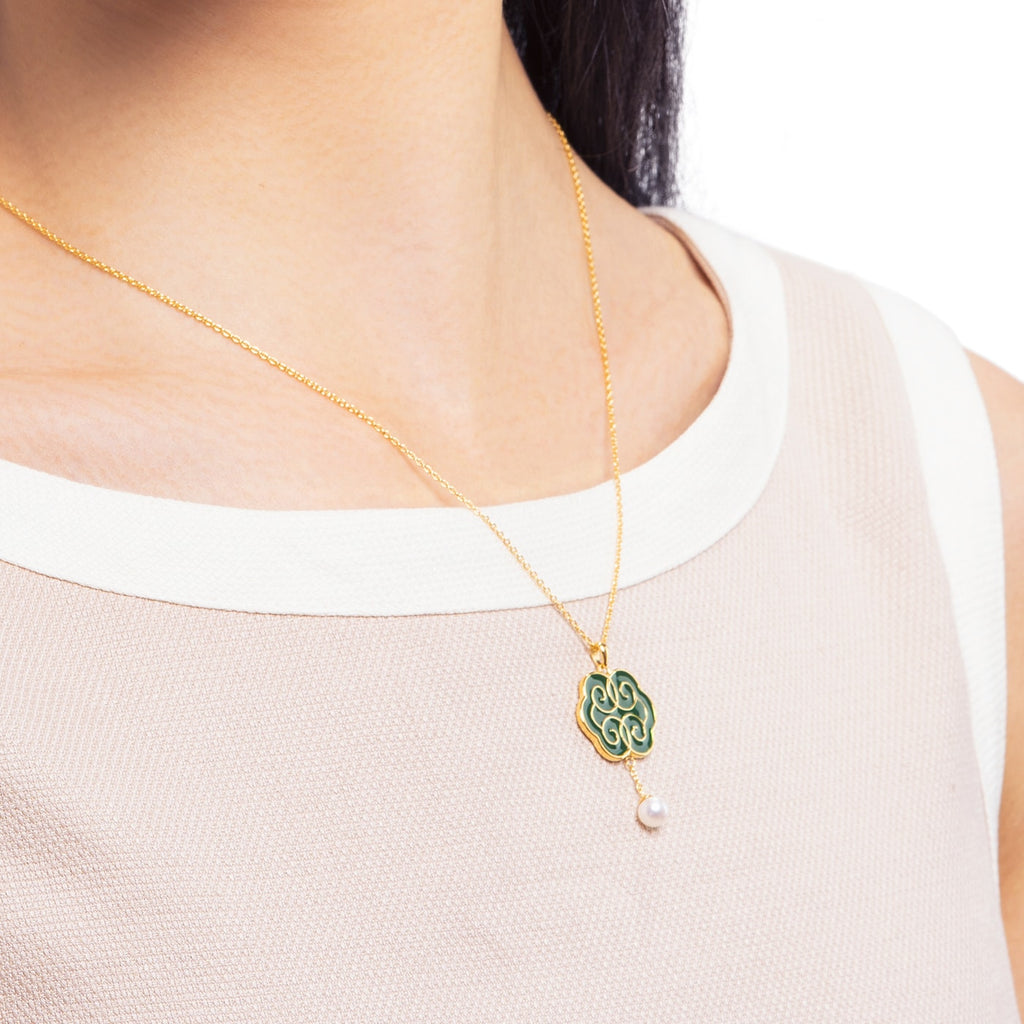 In this 18kt gold-plated jewelry piece, a cloud-shaped, double ruyi is paired with freshwater pearl, creating a design of pure and precious happiness.