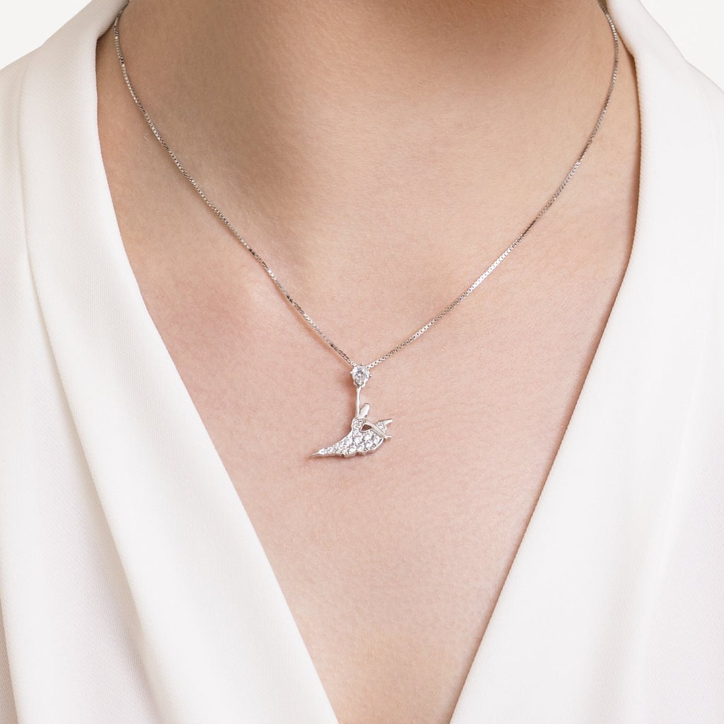 • 0.78" x 0.9" 925 silver or gold plated • 16" chain Made in Korea Pendant • Center gem — zircon gemstones (0.16") • Dancer — 19 zircon gemstones (0.04" - 0.09") Made in Korea