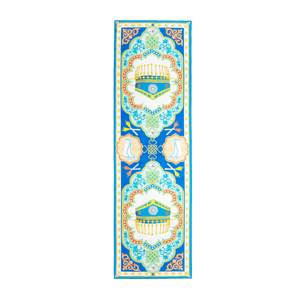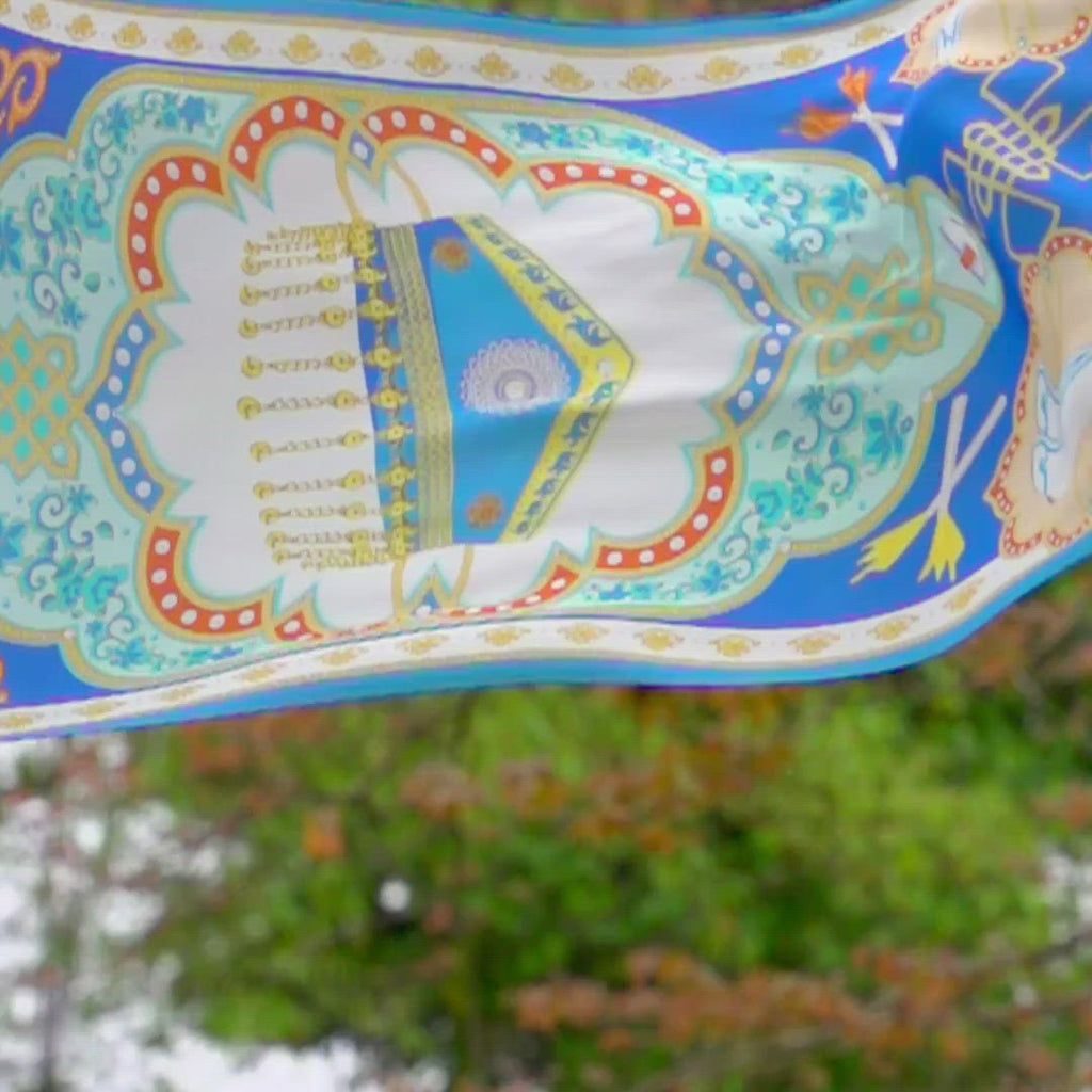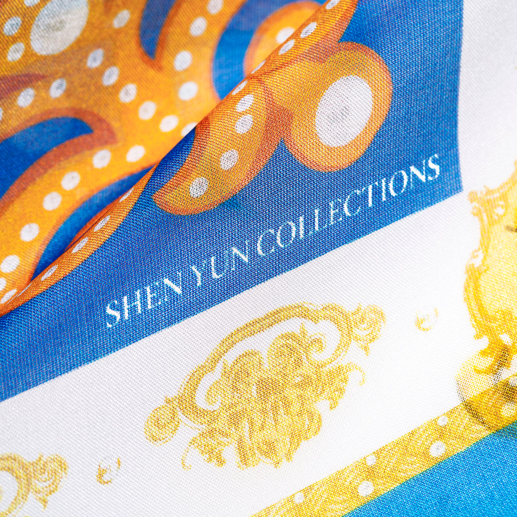 蒼天如蓋,大地長青。駿馬馳騁,在這草原的歡宴上,請您大塊兒頭,傾情歌唱,踏歌起舞,忘盡世間憂傷。此款絲巾設計取材自神韻節目《蒙族碟舞》。絲巾元素包含蒙古靴、珠帽、筷子和氈帳,串連一起成為一個大的 「中國結」。絲巾主題是蒙古族慷慨熱情的民風。